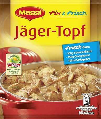 Rezept jagertopf maggi. Nov 9, 19 Érdekel a receptje?. MAGGI fix & fresh creamy salmon gratin (LachsSahne Gratin) (Pack of 4) 46 out of 5 stars 40 $1099 Pioneer Woman Pasta Sauce, 24 oz Jar (Rustic Bolognese, 2 Pack) 47 out of 5 stars 17 $1322 Tone's Italian Spaghetti Seasoning Blend, 14 Ounce 48 out of 5 stars 380 $1436 Only 13 left in stock order soon. Setzt das Wasser für die Nudeln (Reis, Kartoffeln) so auf, dass ihr die frisch abgegossene Beilage (zusammen mit dem Jägertopf) direkt nach dem Salat servieren könnt Auf diese Weise habt ihr ein tolles 3GängeMenu (Salat, Jägertopf, Dessert), das garantiert super ankommt und bei dem aber eure Küche (bis auf den Topf vom Nudelnkochen.