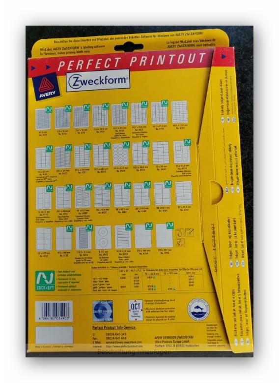 Zweckform Perfect Printout CD Shareware mehr Info Mehr Printout Zweckform Perfect Printout CD Barcode label design printing software retrieve data from database and prints linear and 2D barcodes, text and images Codabar, Code11, Code128, Code39, Code39Ext, Code93, Code93Ext, Ean13, Ean8, Industrial2of5, Interleaved2of5, UccEan128. Zweckform Perfect Printout CD is a Shareware software in the category Miscellaneous developed by Zweckform Perfect Printout CD The latest version of Zweckform Perfect Printout CD is currently unknown It was initially added to our database on 06/06/08 Zweckform Perfect Printout CD runs on the following operating systems Windows. Druckvorlagen & Software Avery Zweckform Produkte gestalten und drucken Service bieten wir Ihnen für alle Etiketten in unserem Sortiment unseren kostenlosen Online Designer Avery® Design & Print Das Besondere daran Wir bieten Ihnen hier eine exklusive Auswahl an vorgestalteten, modernen Vorlagen, die regelmäßig mit aktuellen und.