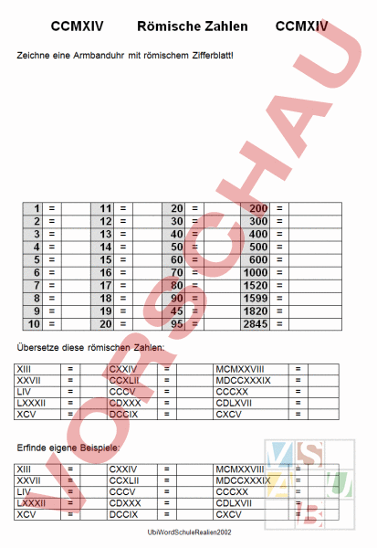 Ziel Römische Zahlen im Zahlenraum von 1 bis 10 Umwandlung von Dezimalzahlen in Römische Zahlen (und umgekehrt) Selbstlerneinheit mit ansteigendem Schwierigkeitsgrad;. Römische Zahlen, Aufgabensammlung aus Mathearbeiten Klassenarbeit 09 November Römische Zahlen , Dualzahlen , Dualsystem , Römische Zahl ins Dezimalsystem , Dezimalzahl in römische Ziffern , Zweiersystem , Koordinatensystem , Senkrecht , Parallel. Römische Zahlen – Übungsblatt 1 Wandle in eine römische Zahl um Als ich dieses Arbeitsblatt erstellte, waren an der Schule knapp über MCCC Schüler in XLIII Klassen, die von CVIII Lehrern unterrichtet wurden Die Schule erreicht man mit der UBahn, und zwar mit der UIV, oder mit dem Bus, zB mit der.