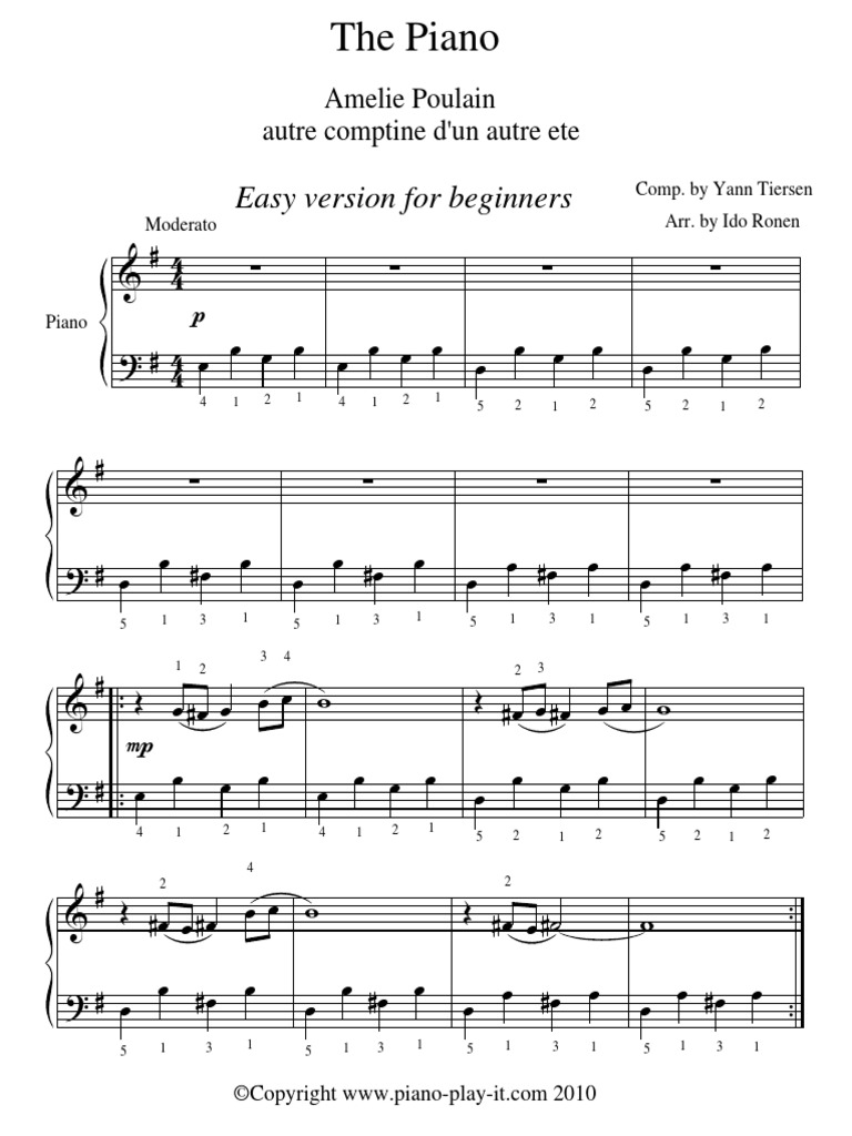 Easy Piano arrangement of Yann Tiersen's "La Valse d'Amélie", soundtrack of the movie "Le Fabuleux Destin d'Amélie Poulain" released in 01 This is a beginner arrangement made short on purpose for beginners to master it within a few sessions of practice It also has the fingerings and the chords. Piano Lessons Piano lessons in Prague I offer piano lessons in Prague for adults and children (7 years) » More information Accordion sheets Visit also the website with my accordion arrangements!. My childhood piano experience was a stressful one, but today playing piano has become for me a nice outlet, a relaxing escape from the computer screen, from answering emails and scheduling calendar appointments Here are 10 simple beautiful songs that I like to play, with printable PDFs Note the YouTube videos are not of me ) Enjoy!.