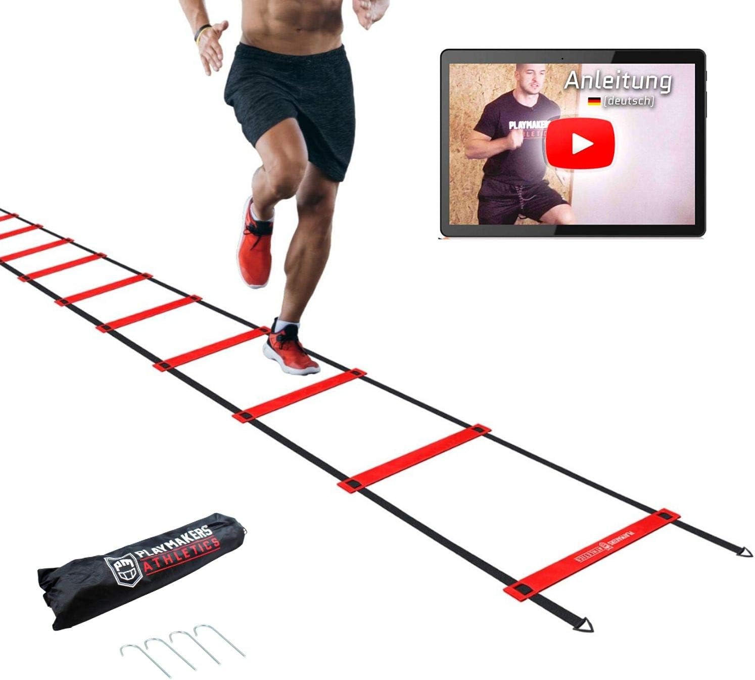 Playmakers Koordinationsleiter Mit Deutscher Videoanleitung Tasche Und Erdnagel Fur Koordinationstraining Im Fussball Basketball Fitness Trainingsleiter 5 5m Mit 12 Sprossen Amazon De Sport Freizeit