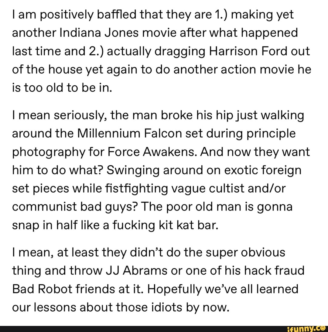Am Positively Baffled That They Are 1 Making Yet Another Indiana Jones Movie After What Happened Last Time And 2 Actually Dragging Harrison Ford Out Of The House Yet Again To Do