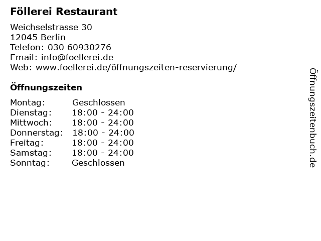 Föllerei Weichselstraße 30, 145 Berlin Neukölln opening hours Dienstag Samstag ab 1800 Tuesday Saturday from 600 pm Sonntag Montag Ruhetag Sunday and Monday Rest Days Kontakt 49 30 info@foellereide. Specialties Kleines deutschfranzösisches Restaurant mit Biofleisch und möglichst saisonalen und regionalen Produkten. Follerei Dinner for one See 100 traveller reviews, 134 candid photos, and great deals for Berlin, Germany, at Tripadvisor.
