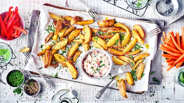 4 Abendessen Rezept Knusprige Kartoffelspalten Mit Dip Steinerprinzip