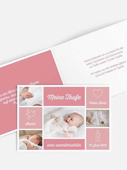 Die bleibende Art Danke zu sagen Unsere Dankeskarten für die Taufe können Sie online mit persönlichem Bild gestalten und drucken lassen.
