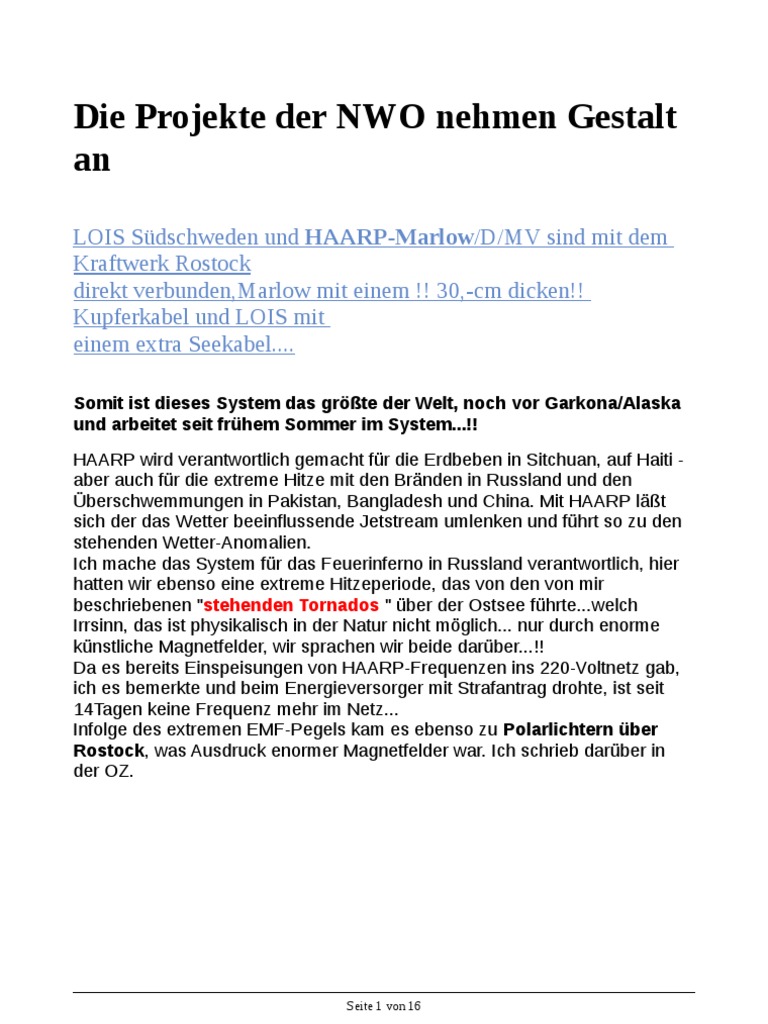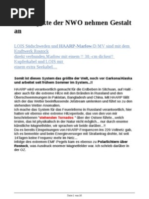 Geoengineering, HAARP, Chemtrails 16 prison planet Earth Galileo PRO 7 HAARPAnlage Marlow prison planet Earth Erfindungen für die Zukunft Maschinen zum Gedankenlesen N24 Doku prison planet Earth Syriens Kinder, Die Story im Ersten, BBC 13 prison planet Earth. HAARP is the name given to a specific technical facility located in the USA (state of Alaska), and stands for High Frequency Active Auroral Research Program It is jointly managed by both the Air Force Research Laboratory and the Office of Naval Research 1 The project was initially built to realise certain militarydefence capabilities as. HAARP Ionosphärenheizer in Rostock /Marlow Das Kraftwerk in Rostock ist ein sogenanntes Spitzenlastkraftwerk mit einer Leistung von 500 MegawattWenn wir jetzt davon ausgehen, dass ein normaler Mittelwellensender, dh die Größten eine Leistung von 500 KW haben, aber das LastKraftwerk in Rostock das Tausendfache erzeugt und diese Leistung.
