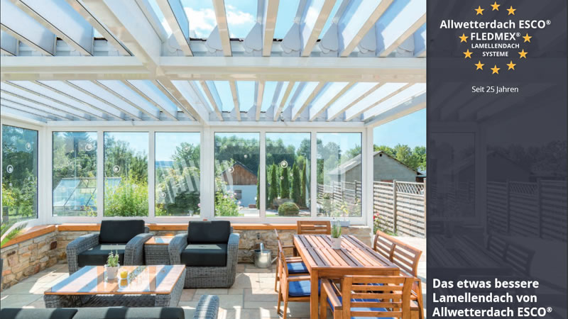 Allwetterdach ESCO GmbH Baumesse Aussteller Allwetterdach ESCO GmbH Terrassenüberdachung von FLEDMEX unter m Das Fledmex Lamellendach der Firma Allwetterdach ESCO bietet Ihnen optimalen Schutz vor direkter Sonne, ohne dabei die anliegenden Wohnräume zu Videos Lamellendächer hier m Fachberatungen von Allwetterdach ESCO in Deutschland D. Allwetterdach ESCO Read more about esco, contre, acier, lamelles, aluminium and inox. Ein Lamellendach ohne Hitzestau!.