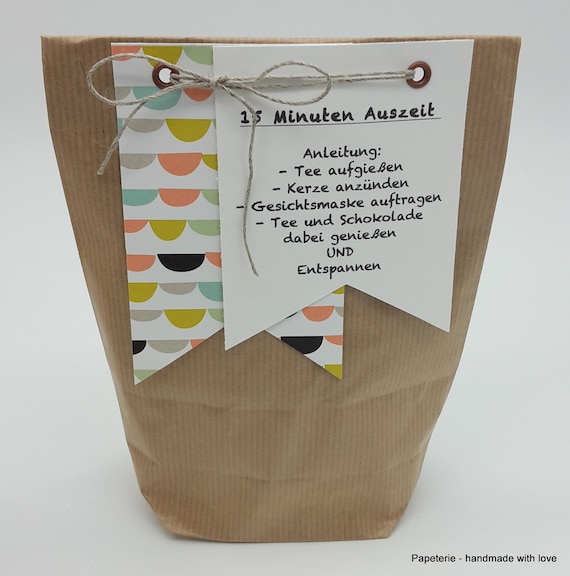 Jede Tüte enthält außen eine Anleitung In der Tüte ist ein Teelicht, Zündhölser, Schokolade, Tee und eine Geschichte enthalten Die Tütchen habe Ich mit den Framelits für die Leckereientüte gemacht Du möchtest *15 Minuten Glück aus der Tüte* verschenken?. 15 Minuten Wellness in der Tüte Die Tüte habe ich aus einem Tapetenrest geformt und so sieht das "Innenleben" aus Gefüllt ist die Tüte mit einer schönen Geschichte, einer Kerze, Streichhölzern, einem Beutel Tee, Gesichtsmaske, einem Badezusatz und einem leckeren Küchlein. Dazu gibt es mit der 30 Minuten Wellness Tüte dann eine Anleitung, wie die 30 Minuten zum puren Genuss werden Heute zeige ich euch ein weiteres Projekt, welches ich für den Ostermarkt gemacht habe, 30 Minuten Wellness, ein Klassiker Ich habe mich diesesmal für eine Verpackung in der Tüte entschieden.