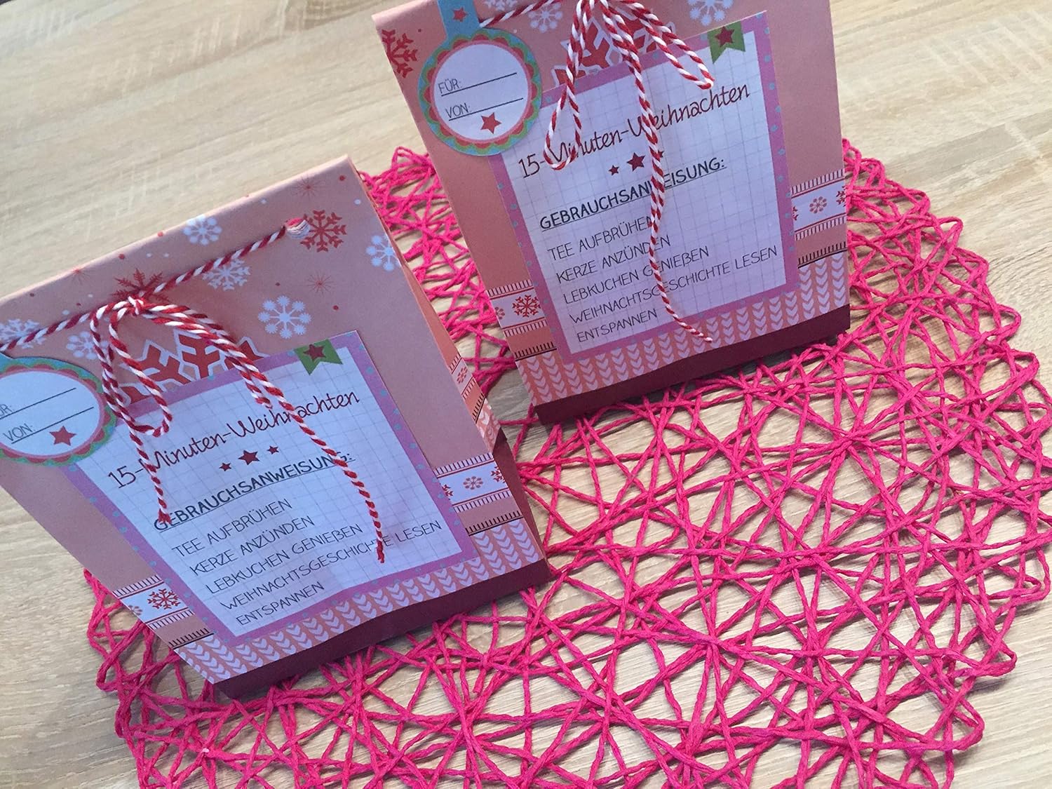 15 Minuten für Dich oder 15 Minuten Weihnachten in der Tüte Diese einfache und zauberhafte Geschenk Idee hat viele Namen und kann für viele Anlässe abgeändert werden Doch eins hat sie immer gleich, der Beschenkte wird sich von Herzen freuen. Vielleicht kennst Du schon die beliebte Geschenkidee von 15 Minuten Weihnachten in der Tüte Die Idee ist, jemandem alle Zutaten für eine 15 Minuten Auszeit in der Hektik der Vorweihnachtswochen zu schenken. Dann ist dieser Beitrag genau das Richtige für dich.
