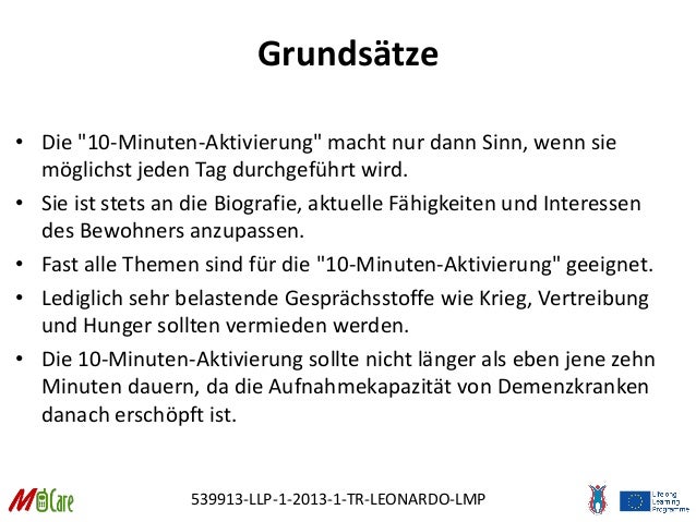 10 Minuten Aktivierung Was ist eine 10 Minuten Aktivierung?. 10 minuten Aktivierung für Demente 1 Vorbereitungen 11 benötigtes Material 12 Raum/Raumgestaltung 2 Biographie des HB 3 Erläuterung der Aktivierung 4 Ziele der Übung 5 geplanter Verlauf der Übung 51 Einleitung 52 Hauptteil 53 Schluß 6 Resümee 1 Vorbereitungen 11 benötigtes Material. Die Teilnehmer der 10MinutenAktivierung nehmen das Material nacheinander in die Hand Je nach den individuellen Möglichkeiten der Teilnehmer werden die Gegenstände benannt und die Einsatzmöglichkeiten besprochen Geschichten aus dem Leben der Teilnehmer sind zu jedem Zeitpunkt der Aktivierung herzlich willkommen.