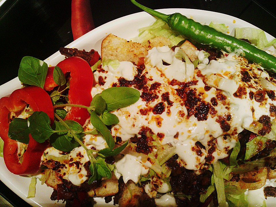 Und die Sauce der Döner Pizza kann ein Tzatziki auf Joghurtbasis oder ein Tahini aus dem Nahen Osten sein Wenn Sie zu Hause das KebabFleisch zubereiten möchten, müssen Sie schon kreativ für das langsame Grillen des Fleisches sein Für die meisten Haushaltsküchen ist eine gewisse Improvisation erforderlich. Die Dönerbuden, die ich in der Regel besuche, backen ihr Brot selbst Yufka mit alles inklusive Weißkraut, Rotkraut, geschnibbelten Tomaten und Gurken, gerne auch Tzatziki Joghurtsoße nur in Kombination mit scharf, ansonsten ohne Soße. Für die besondere Würze verwende ich gerne Kurkuma, Cumin und frische Kräuter, wie Petersilie und Koriander Das Fladenbrot wird je nach Zeitfenster selbst gemacht oder von der Dönerbude meines Vertrauens frisch gekauft und gegebenenfalls nochmals im Ofen aufgebacken Abgerundet wird mein FalafelDöner mit einer leckeren Knoblauch.
