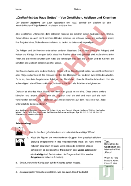 Arbeitsblatt Die Standeordnung Geschichte Mittelalter