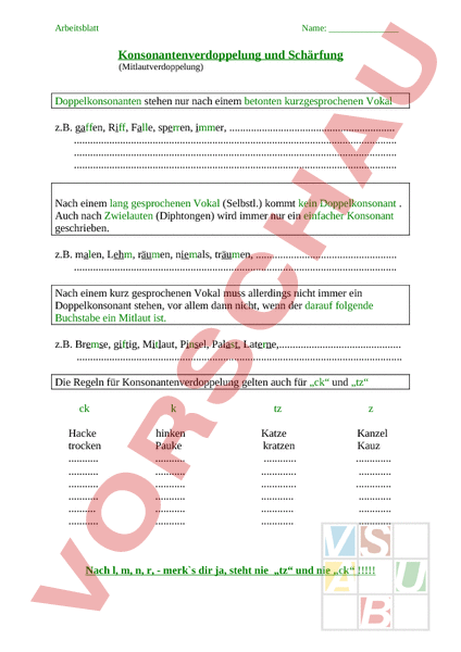 KonsonantenVokaleArbeitsblatt5pdf Auf diesem Arbeitsblatt dreht sich alles um die Ausnahmen von der Regel zur Konsonantenverdopplung Die richtige Schreibweise bei tz und ck wird anschaulich und beispielhaft eingeführt und geübt Vorschau Mappe Merkliste KonsonantenVokaleArbeitsblatt6pdf.