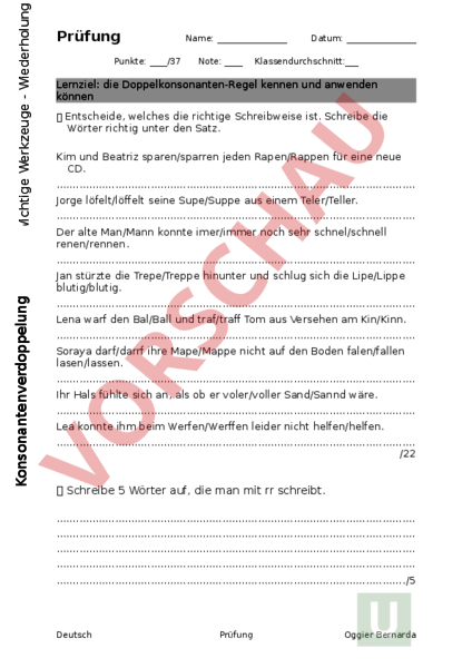 Arbeitsblatt Prufung Doppelkonsonanten Deutsch Rechtschreibung