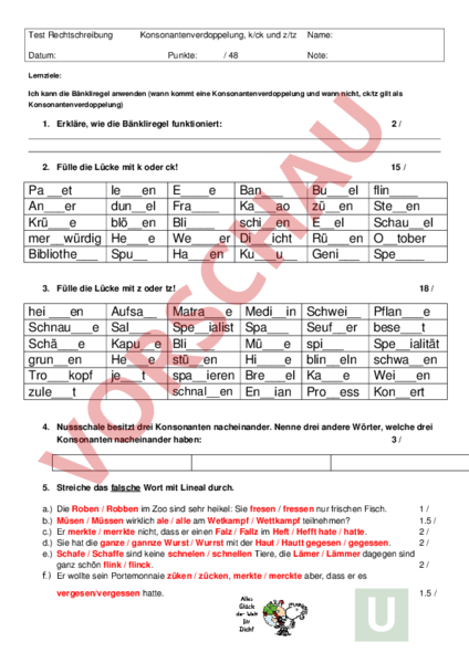Doppelkonsonanten 1 Kreuze die richtige Aussage an Vokale oder Umlaute vor Doppelkonsonanten werden O lang O kurz gesprochen 2 *Entscheide dich, ob ein doppelter oder ein einfacher Konsonant eingesetzt werden. Arbeitsblätter zum Ausdrucken von sofatutorcom Schreibung von Konsonanten nach kurzen Vokalen (Stammvokalen) 1 Gib für jede Regel ein passendes Beispiel an 2 Bestimme, ob der Stammvokal kurz oder lang ist 3 Ergänze die Regeln zu kurzen Stammvokalen 4 Erläutere die Regeln zur Konsonantenverdopplung 5 Ermittle Beispiele für die Regeln zu kurzen Vokalen. Der Held des Spiels Deutsch Übungen / Konsonantenverdopplung Eine peinliche Vorstellung Diktat Als Substantive gebrauchte Adjektive Ein gelungener Aben ;.