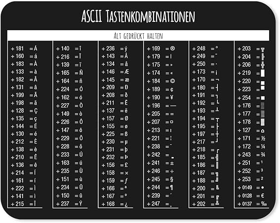 Mauspad Mit Ascii Code Tabelle I Tastenkombinationen I Amazon De Elektronik