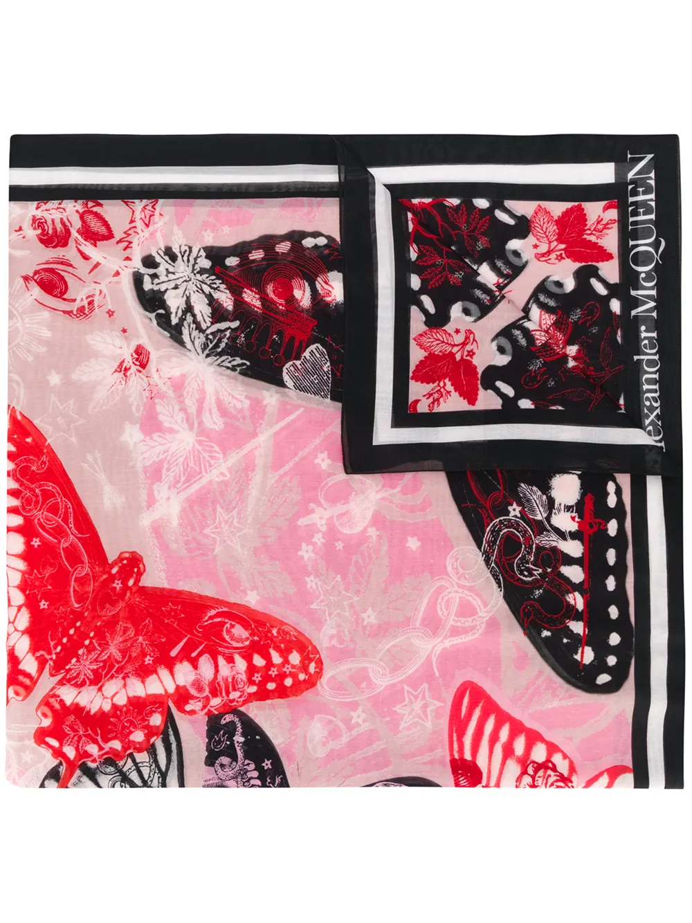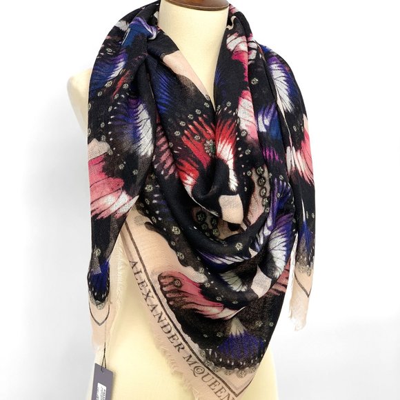 Shop Alexander Mcqueen Inked Butterfly Scarf In Black from 300 stores, starting at $359 Similar ones also available On SALE now!. What can you expect from an Alexander McQueen scarf?. Alexander McQueen presents this twill foulard scarf, graced with butterfly graphics over a soft pink backdrop Stamped with the label's moni.