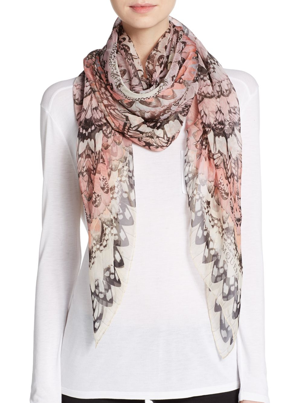 Shop Alexander McQueen Women's Accessories Scarves & Wraps at up to 70% off!. Alexander McQueen Butterfly Print Scarf $470 $5 Get a Sale Alert at Saks Fifth Avenue Janavi Glitter Butterflies Cashmere Scarf $625 Earn 8% cash back at Wolf & Badger Wolf & Badger Cosel Scarf Yellow Butterfly $119 Get a Sale Alert at Alexander McQueen Alexander McQueen Butterfly Seal Silk Scarf. Alexander McQueen Butterfly Decay silk scarf Pink silk Butterfly Decay silk scarf from Alexander McQueen featuring butterfly print, logo print to the front, contrasting trim and square shape.