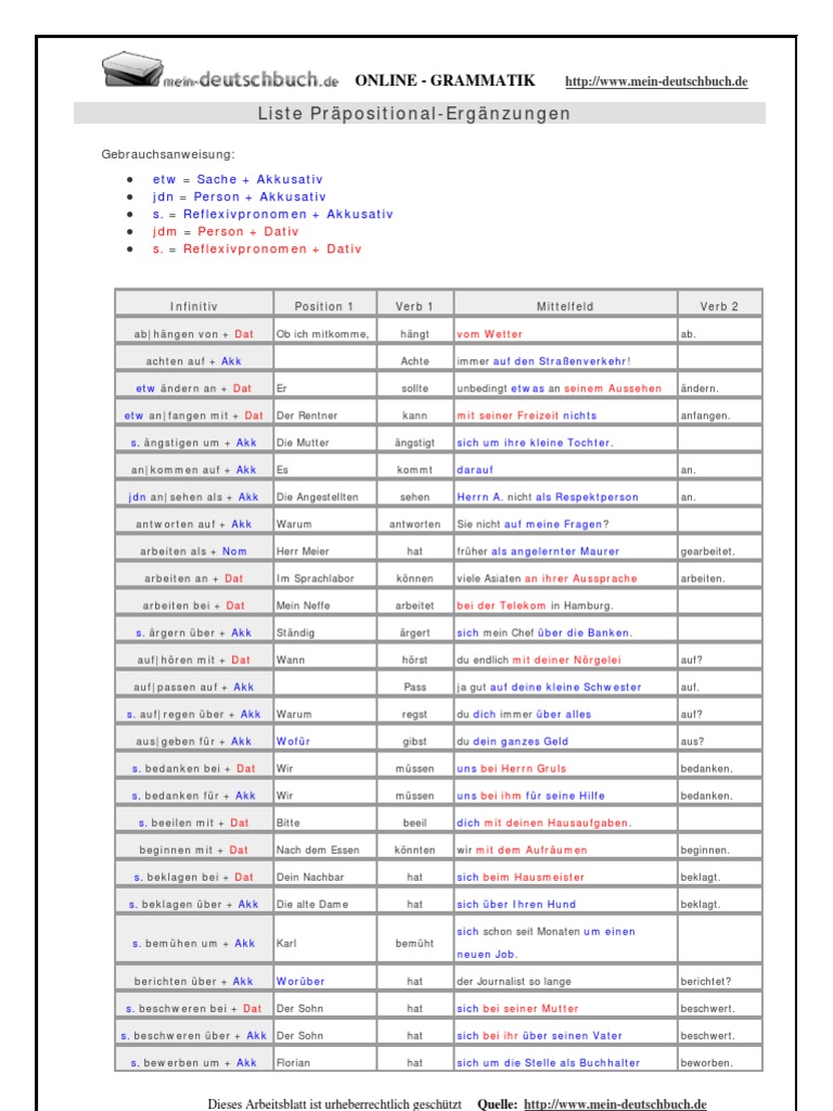 OnlineGrammatikübungen für DaF Niveau inklusive PDFDateien zum Downloaden Übungen zu Perfekt, Adjektivdeklination, Präpositionen, Verben mit Präpositionen. Präpositionen im Akkusativ und Dativ Wechselpräpositionen Kopiervorlage für Lehrer und Lernende des Fachs Deutsch als Fremdsprache Mit dieser Kopiervorlage haben Sie wichtige Präpositionen im Blick Das Arbeitsblatt kann im Unterricht eingesetzt werden. Ihr könnt sehr viele Übungen für A1 bis C2 machen und ein PDF mit über 30 Seiten und allen Verben sowie Beispielsätzen kostenlos herunterladen In der deutschen Sprache gibt es neben den Verben, die mit einem Akkusativ oder Dativobjekt stehen, zahlreiche Verben, auf die eine Präposition folgt.