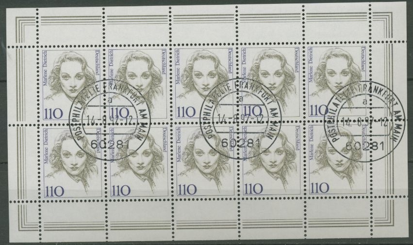 Bund 1997 Freim Frauen Marlene Dietrich Kleinbogen 1939 K Gestempelt C Briefmarken Dr Rohde Kornatz Kassel