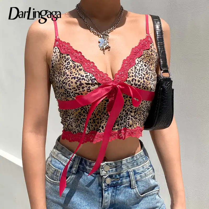 Darlingaga Spaghetti Strap Spitze Patchwork Rosa Top Y2k V V Ausschnitt Vorder Tie Up Crop Top Frauen Cami Mode Sexy Sommer Tops Leibchen Leibchen Aliexpress