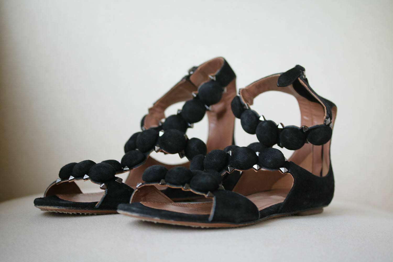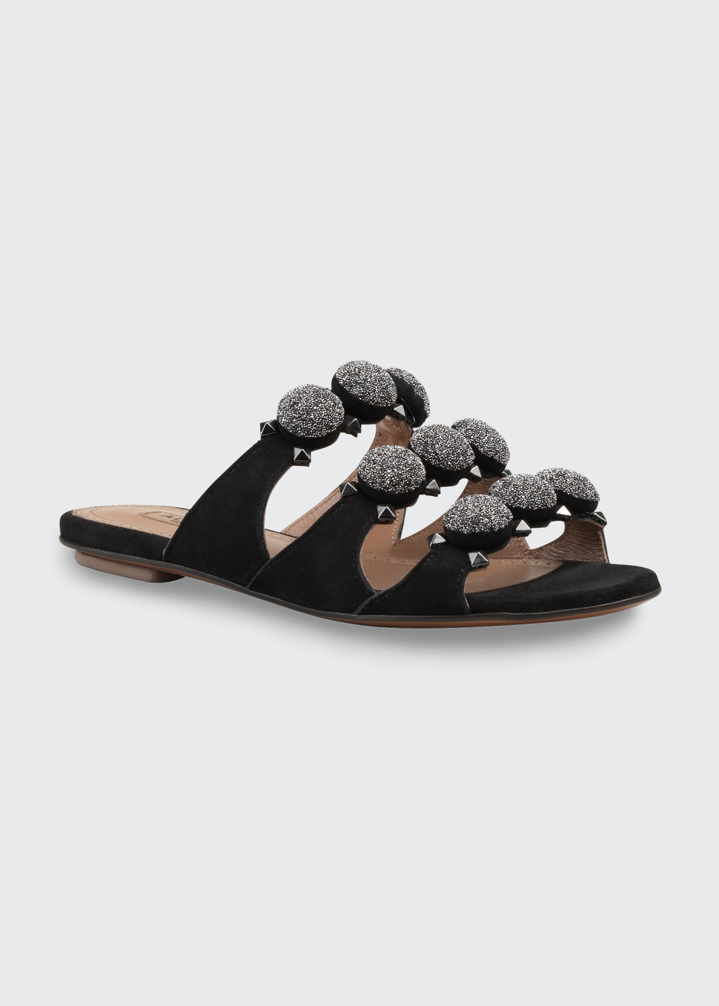 Womens Alaia Flat Shoes Bombe Studded Suede Sandals Black Black Rosalia Fedesa