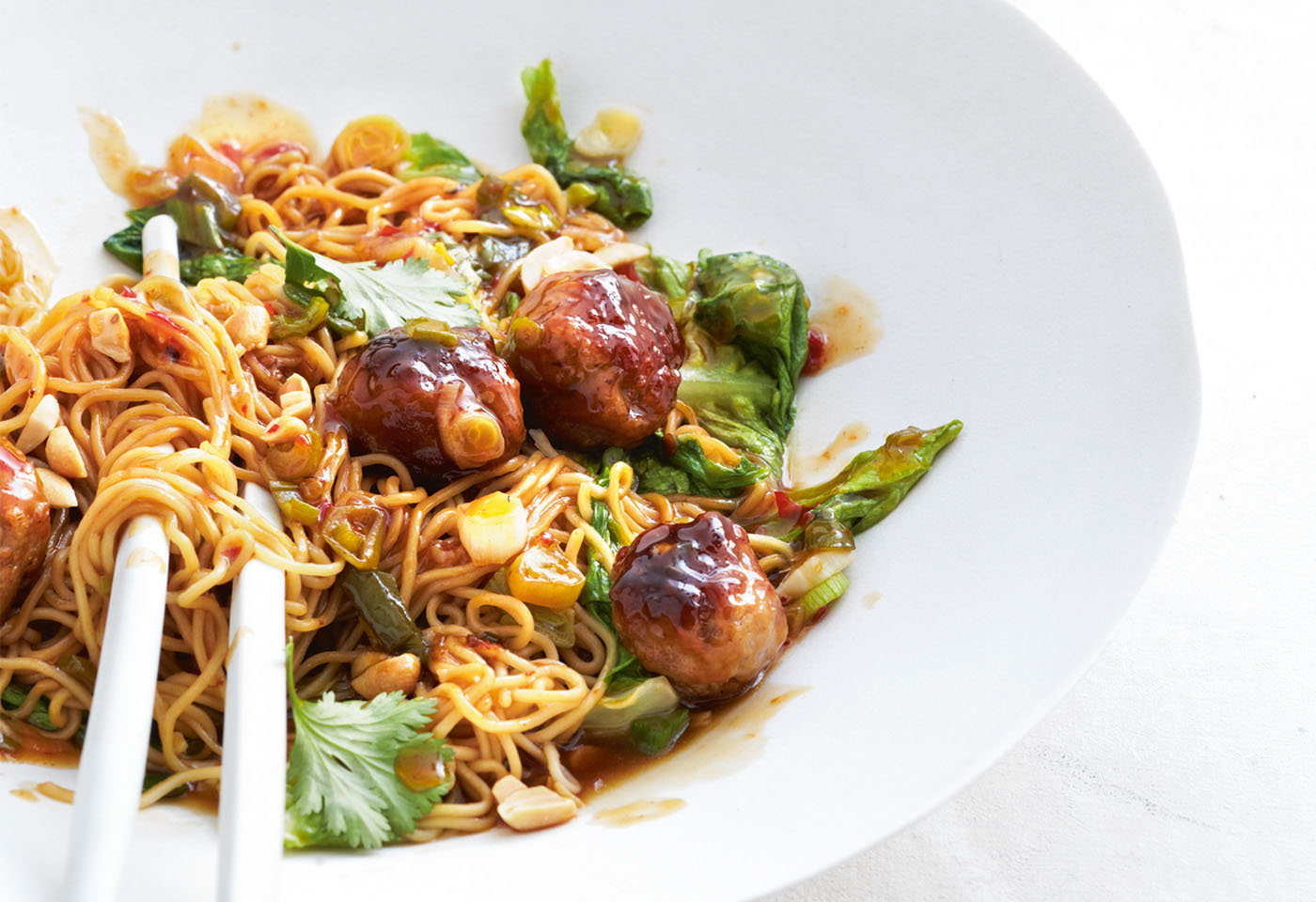 Asiatische Fleischballchen Mit Gebratenen Nudeln Frisch Gekocht