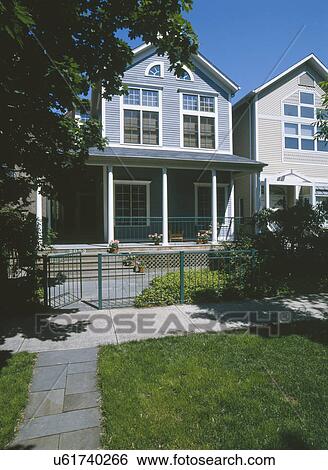 Fassade Von Blau Grau Bungalow Mit Weiss Trimmen Stock Fotograf U Fotosearch