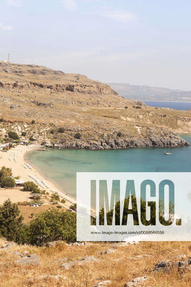 Stockfoto View Of Lindos Beach And Bay Rhodes Greece