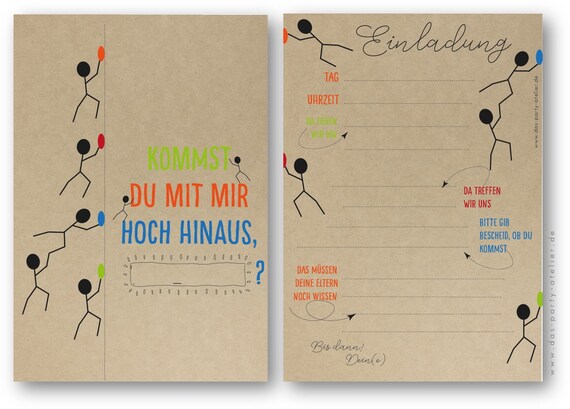 Wer kann schon von sich behaupten, an seinem Geburtstag steilste Kletterwände erklommen und gähnenden Tiefen ins Auge Ideen für Einladung zum Kindergeburtstag mit Klettern Hallo!. Schöne 3D Einladungskarte für alle Kletterfans mit individueller Beschriftung auf der gepunkteten Fläche* Liebevoll ausgeschnittene Kletterer MAX aus starkem Fotokarton im blauen TShirt und schwarzen Shorts und trendiger Cap, auf Sisalseil Die. Re Einladung zum Klettergeburtstag Antwort von laranina am , 10 Uhr Hallo bastel doch aus Paketkordel und kleinen Holzästen (Wald) eine Leiter, unten an der letzen Sprosse befestigst du dann einen kleinen Zettel mit dem Einladungstext (reicht doch wenn die Leiter 3 Sprossen hat, ansonsten nimm Schaschlikstäbchen evtl einkürzen).