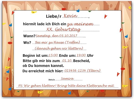 Wer kann schon von sich behaupten, an seinem Geburtstag steilste Kletterwände erklommen und gähnenden Tiefen ins Auge Ideen für Einladung zum Kindergeburtstag mit Klettern. Hier findest du fertige Textideen für deine Einladung zum Kindergeburtstag Ob ganz klassisch oder für eine Pferde oder Piratenparty Vorher habe ich noch ein paar Tipps, was bei einer Einladung zum Geburtstag so alles zu beachten ist Wenn du nur die Texte anschauen möchtest, scroll einfach weiter runter 🙂 Kindergeburtstag – YAY!. Einen Klettergeburtstag in einer Kletterhalle zu feiern ist meistens nur für Kinder ab einem bestimmten Alter möglich und oft auch abhängig von der Größe der Geburtstagsgruppe Informiere dich deshalb rechtzeitig bei eurer örtlichen Kletterhalle über die verschiedenen Angebote, die es gibt.