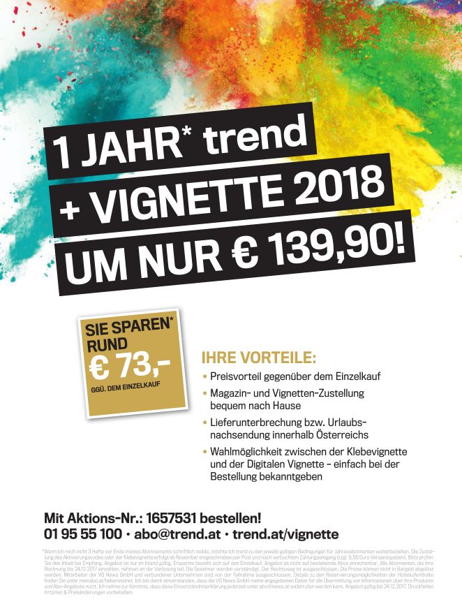 Winterbettdecke Zirbe Hautnah genießen die wohltuende Wirkung duftender Zirbe € 179,00. Gratis Autobahn Vignette 21 kostenlos Das Autobahnpickerl 21 (diesmal in grün bzw genauer apfelgrün) könnte man ganz normal bestellen Ob man es bereits kaufen soll, alle Details zur Autobahnvignette 21 und die Ideen, wie man die Vignette auch gratis bekommen kann, finden Sie hier!. 16 Nov Abo ServusAbo schenken 16 Nov Abo Das Kinderheft ist da!.
