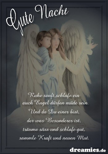 Der Engel, der die Träume macht Songtext von Gerhard Schöne mit Lyrics, deutscher Übersetzung, MusikVideos und Liedtexten kostenlos auf Songtextecom. Gute Nacht, auf dass jemand dich bewacht, ein Engel oder eine Elfe ️ Schönen Abend und gute Nacht Bilder Gute Nacht zu sagen ist nicht schwer, doch es Dir zu schreiben um so mehr, ein Küsschen wollte ich Dir noch schicken, doch mein Handy machte Zicken Ich bin eine GuteNachtSMS Ich wache über deine Träume, wenn du schläfst. 25 Ich wünsche dir nun ein Wolkenmeer für dein Bett und strahlende Kristalle für die Sterne Während du schläfst, mögen die Engel süße Lieder spielen, und dir schöne Träume bringen 26 Der Mond am Himmel scheint für Dich, er sagt zu Dir vergiss mich nicht.