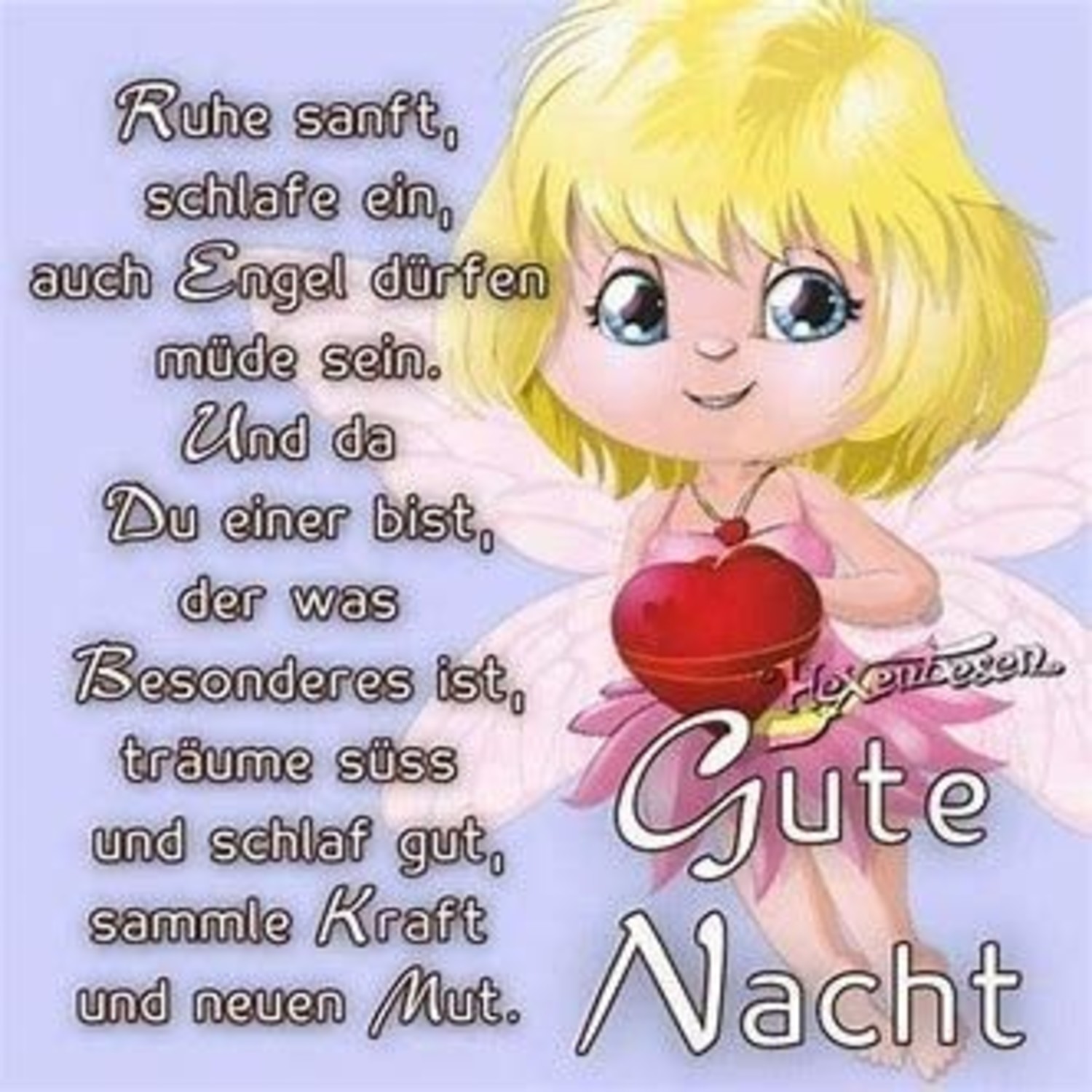 2902 Gute nacht engel bilder Gute nacht engel bilder – Schönes BilderGB BilderWhatsapp BilderGB PicsFacebook Bilder. „Gute Nacht und schöne Träume“ Jeder geht irgendwann einmal zu Ende Für eine erholsame Nacht ist gesorgt Ihr Bett in einem unserer jeweils 12 Doppel und Einzelzimmern empfängt Sie mit offenen Armen Und am nächsten Morgen sorgt ein reichhaltiges FrühstücksBüffet für die richtige Einstimmung auf einen erlebnisreichen und. Gute Nacht Gedichte zum Einschlafen für Kinder Kommt ein Traum gesegelt, aus der Wolke sacht, kuschelt sich zum Timo (oder wie das Kind heißt), schlaf schön gute Nacht Husch, husch, husch, ins Bett geschwind, schlüpft am Abend jedes Kind Sandmann kommt auf leisen Sohlen, steigt durchs Fenster ganz verstohlen, schleicht im Nachthemd durch das Haus und schüttet seine Träume aus.