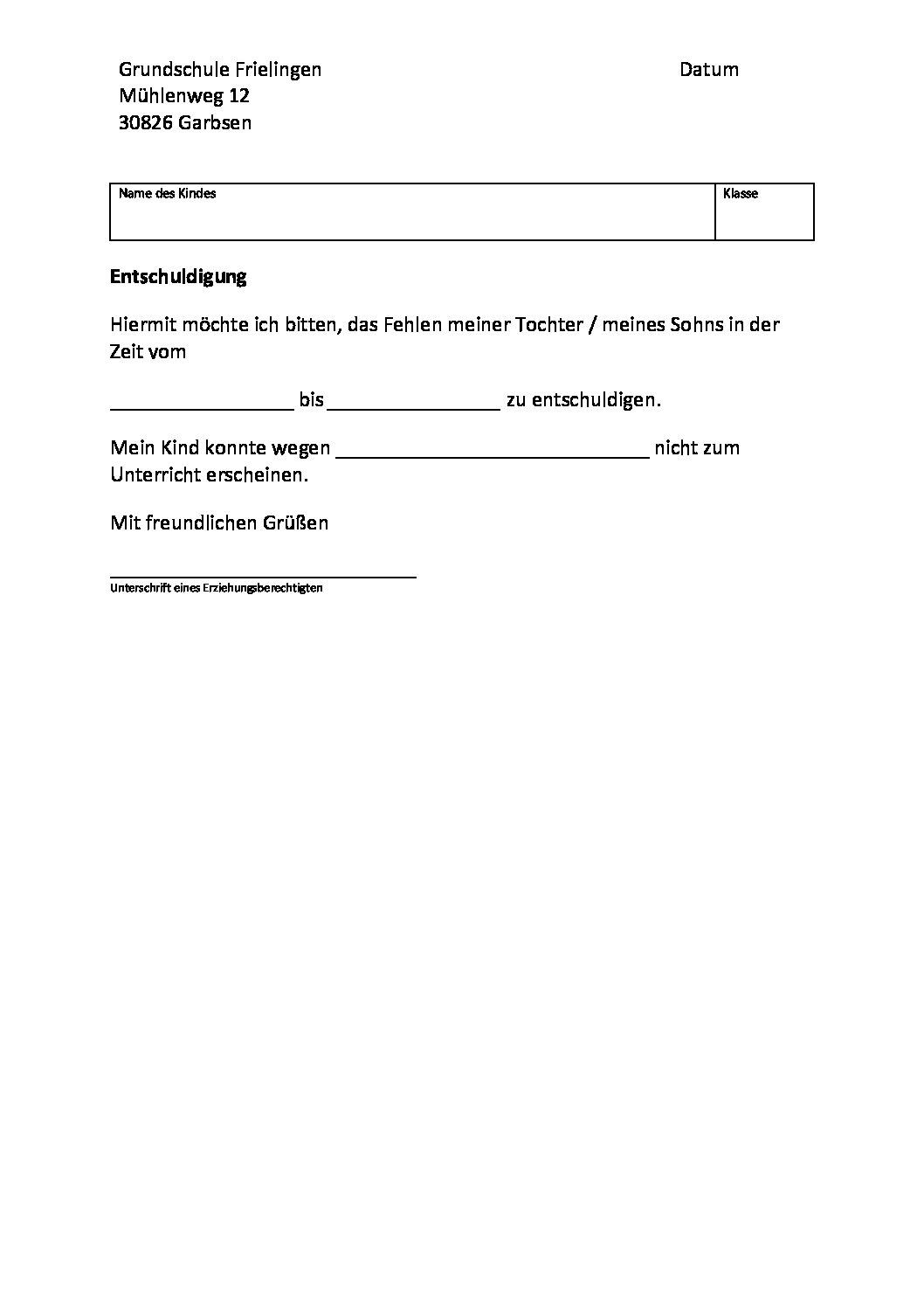 Bitte benutzen Sie für Beurlaubungen das Formular auf der Homepage der Schule _____ Name _____ _____ Anschrift. Vorlage für Entschuldigung (Muster zum Kopieren) Kann eine Schülerin/ein Schüler aus Krankheitsgründen den Schulunterricht nicht besuchen, so sind die Eltern dazu verpflichtet, dies am selben im Schulsekretariat telefonisch zu melden Bei der Wiederteilnahme am Schulunterricht ist der. Musterbrief als PDF & DOC herunterladen und beliebig oft verwenden Vorlage für eine Entschuldigungsschreiben an die Schule wegen Krankheit sofort zum Download Ja, ich willige ein, dass die Formblitz GmbH mir regelmäßig News zu rechtlichen Änderungen und Sonderaktionen an meine oben genannte EMailAdresse schickt.