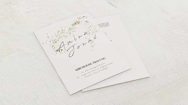 Leicht individualisierbar Danksagung zur Goldenen Hochzeit ohne Bild oder mit einem Foto des Ehepaars – beides ist möglich Beratend an Ihrer Seite Möchten Sie die Danksagung zur Goldenen Hochzeit selbst gestalten und haben Fragen zur Nutzung des Konfigurators, der Farben oder der Papiersorten, beraten wir Sie gern telefonisch. Ihre Hochzeit soll der schönste in Ihrem Leben werden Für viele Paare ist die kirchliche Trauung ein unentbehrlicher Bestandteil der Hochzeit Damit die Trauung in den richtigen Rahmen gesetzt wird, sollten Sie frühzeitig das passende Kirchenheft für Ihre Hochzeit aussuchen. Für die Taufe Kirchenheft zur Zeremonie online gestalten und drucken lassen Ob als Postkarte, Klappkarte oder mit Einleger.