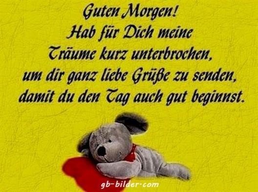 Guten Morgen Sonnenschein, lass mich in Dein Herz hinein Ich denk an Dich am heutigen , weil ich Dich ganz besonders mag Wenn Du an diesem Morgen aufwachst, Dir Deine süßen Augen reibst und diese Mail liest, wirst Du wissen, dass ich Dich sehr gern und sehr lieb habe. Mit diesen Guten Morgen Grüßen und Sprüchen mit Bildern kann man seinen Liebsten, Freunden und Kollegen auf verschiedene Art und Weise einen Guten Morgen wünschen Mit dabei sind natürlich Grüße an den Schatz, lustige Guten Morgen Grüße und guten Morgen KaffeeGrüße dürfen auch nicht fehlen. Guten Morgen SMS Hier kannst du dir die besten Aufwachgrüße heraussuchen Guten Morgen SMSSprüche in dieser Rubrik 257 Wo krieg ich jetzt 'nen Spruch schnell her, um dir zu sagen, ich liebe dich sehr!.