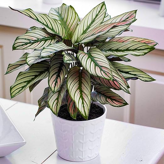 Native to the subtropics, particularly the rainforests of Brazil, this stunning decorative plant has gorgeous large dark green with striking white stripes This plant is a type of Calathea so you will notice that the leaves open and close from day to night This plant is also a great for air purifying. The decorative leaf is characteristic of the Marantaceae It is mainly the leaves that determine the attraction value of the plant The cultivars have very different leaf colors and grain drawings The colors range from silver, whitepink to various shades of green The most important genus of the Marantaceae family is the Calathea. Its beautiful foliage of bright white veins against green, red and cream leaves provides interesting and unique texture to any room of your house Easy to care for, the calathea plant will have everyone thinking that you have a gifted green thumb.