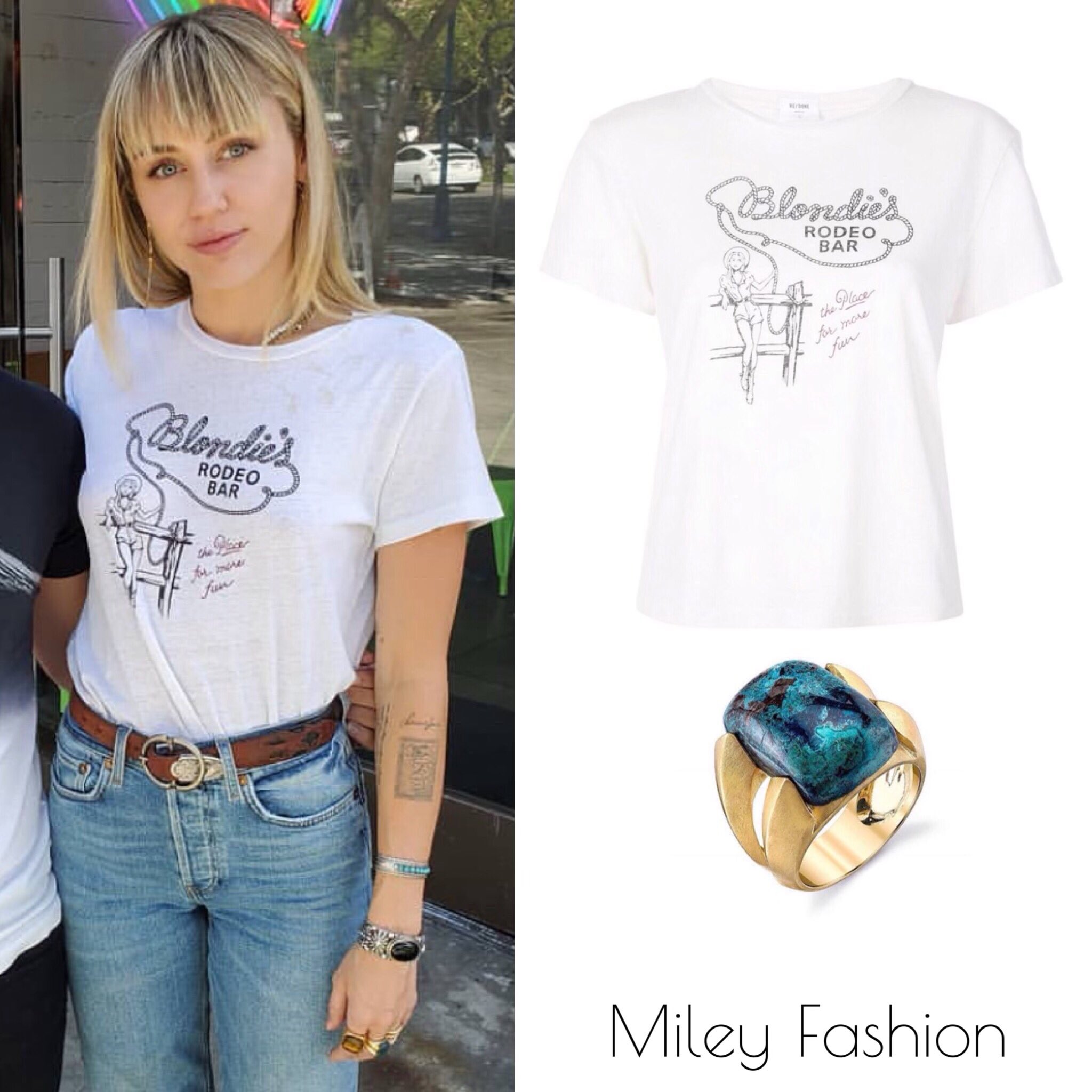 Miley Cyrus Fashion Style Guide Mileycyrus Was Seen Posing With A Fan In La Earlier Today Wearing Shop Re Done Blondies Rodeo Classic Tee 115 Karma El Khalil Chrysocolla