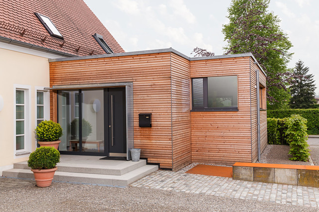 Anbau Holz Modern Stahltrager Holzverkleidung Fenster Flachdach Spitzdach Www Philipkistner Com Anbau Haus Moderne Hauser Einfamilienhaus
