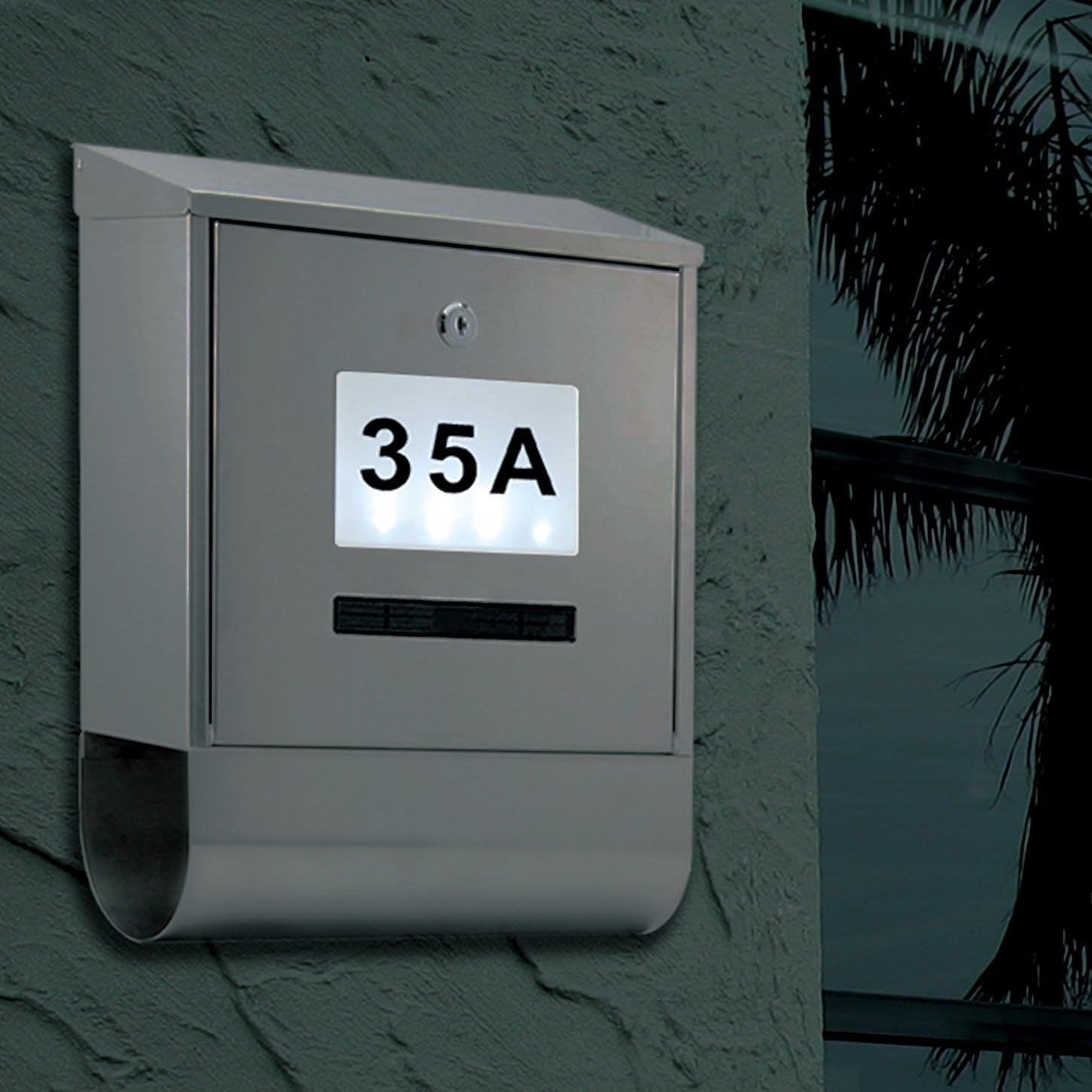 Der Briefkasten aus Edelstahl mit Solar Hausnummer vereint schönes Design, hochwertige Verarbeitung und hohe Funktionalität in einem Das robuste Modell ist aus rostfreiem Edelstahl gefertigt und verfügt über ein separates Zeitungsfach. BONADE Solar Briefkasten mit Zeitungsfach Zeitungsbox EinwurfFormat, Edelstahl Wandbriefkasten mit beleuchteter Hausnummer und Namensschild, abschließbar Inkl 2 Schlüsseln 4,3 von 5 Sternen 28 61,98 € 61,98 €. Exklusive Hausnummernschilder aus Edelstahl mit integrierter LEDBeleuchtung direkt vom Hersteller online bestellen Große Auswahl im Onlineshop.