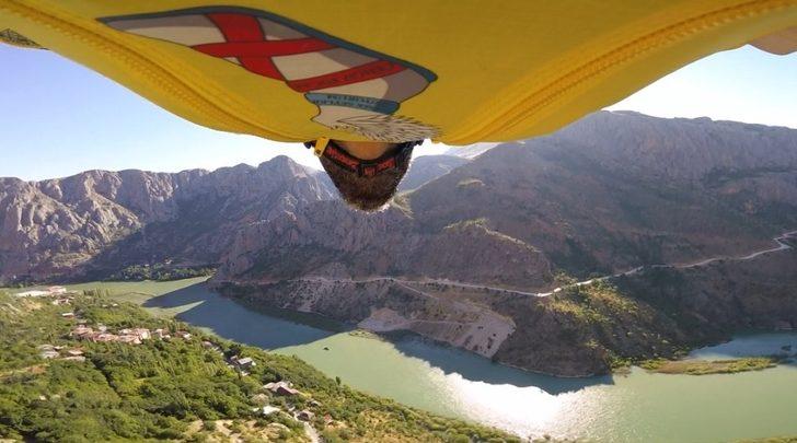 Yarasa adam uçuşu yaparak iki paraşütün arasına gerilmiş flamanın yaklaşık bir metre üstünden ve 210 kilometre saat süratle geçip paraşütümü açıp yere indim" diye konuştu.