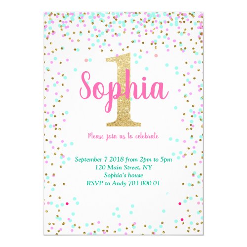 1 Geburtstag Madchen Einladungskarte Personalisiert Gold Glitter Und Rosa Blumen Flo18a