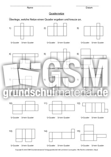 Quadernetze Lösungen Quadernetze erkennen Welche der folgenden Figuren stellen das Netz eines Quaders dar?. Je nach Lernstand und zusätzlichem Übungsbedarf der Klasse ist es durchaus auch möglich, nur einzelne Elemente dieser Einheit (z B in Verbindung mit Einheit 1) zu nutzen Der Umgang mit Würfelnetzen wird in der zweiten Einheit fortgesetzt, indem der Frage „Wie viele verschiedene Würfelnetze gibt es?" nachgegangen wird. Es ist sehr schade, dass ich euch dieses Thema nicht mit Anschauungs Gegenständen erklären kann!.