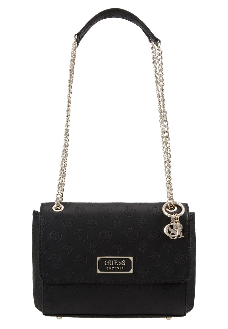 This Black Guess Logo Love Crossbody Bag handbag, Item code. Logo Love Shoulder Bag #SG7662 • Synthetic material outer • Measurements 275x9x14cm • Flap closure Allover debossed 4G and peony logo detailing Shoulder Strap with chain, length approx cm Pale gold hardware Metal logo script plate on front. TriFold Wallet Model Logo Love;.