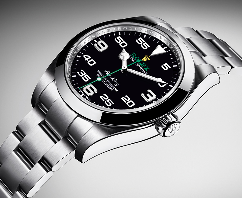 In 16 the Rolex AirKing resurfaced with the most dramatic redesign the collection has ever seen Its case is now a more contemporary 40mm across, and its dial indices include Arabic numerals indicating minutes at 5, 10, , 25, 35, 40, 50, and 55, and oversized hour indices at 3, 6, and 9 made of mirrorpolished white gold. The AirKing costs some percent less than the basic Milgauss, making it a fairly sweet deal And it’s only about 10 percent more expensive than the Oyster Perpetual 39, the most basic men’s Rolex Oyster It’s hard to argue with that The AirKing ref retails for US$60, SFr5900 or S$ Back to top.
