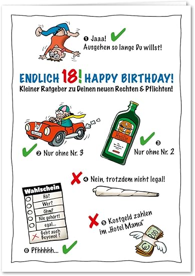 Ohne Freunde und Verwandte läuft ein 18 Geburtstag nicht Die passende Karte sollte als Einladung daher nicht vergessen werden Besondere Einladungskarten zum 18 Geburtstag von FamBooks Oft beginnt die Freude zum 18 Geburtstag Wochen im Voraus und das ist auch gut so Denn eine gute Feier der Volljährigkeit will organisiert sein. Kostenlose Hotline Wir sind für Sie erreichbar von Montag bis Freitag, 800 1630 Uhr 0800 260 1000 oder service@wunderkartende ALLGEMEINE FRAGEN >. Bist Du für Deinen ganz besonderen Humor bekannt?.