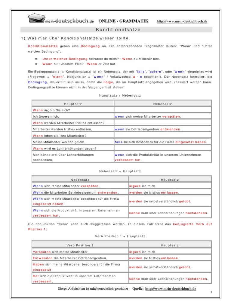 Arbeitsblätter zur Festigung der grammatischen Strukturen Anbei werden Übungsmaterialien zur Festigung der theoretischen Kenntnisse angeboten Die Übungen sind für Selbstlerner konzipiert, dürfen aber ebenso im Unterricht unter Hinweis auf den Urheber meindeutschbuchde eingesetzt werden. Konditionalsätze 1) Was man über Konditionalsätze wissen sollte Konditionalsätze geben eine Bedingung an Die entsprechenden Fragewörter lauten "Wann" und "Unter welcher Bedingung" • Unter welcher Bedingung heiratest du mich?. Kostenlose Arbeitsblätter und Unterrichtsmaterial für die Grundschule zu den Fächern Deutsch, Mathe, Sachkunde und Englisch sowie Arbeitsblatt Generatoren.