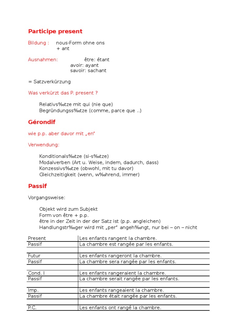 Das „partizip present“ braucht man aber auch zur Bildung des Gerondif, für dass es im Deutschen keine Entsprechung gibt, zB „en amusant“ oder „en parlant“ Mit dem „Gerondif“ drückt man aus, dass zwei Handlungen gleichzeitig erfolgen Haupt und Nebensatz haben das selbe Subjekt. Formale Bildung → Lebenslauf Überprüfung der Angaben in der Bewerbung gleiche Chancen für jeden großer Druck auf den Bewerbern gute Selbstdarsteller im Vorteil für nervöse Kandidaten problematisch Blätter Gepostet vor 14th July 15 von A 0 Kommentar hinzufügen Zusammenfassungen. Informationen zu den Urhebern und zum Lizenzstatus eingebundener Mediendateien (etwa Bilder oder Videos) können im Regelfall durch Anklicken dieser abgerufen werden Möglicherweise unterliegen die Inhalte jeweils zusätzlichen Bedingungen Durch die Nutzung dieser Website erklären Sie sich mit den.
