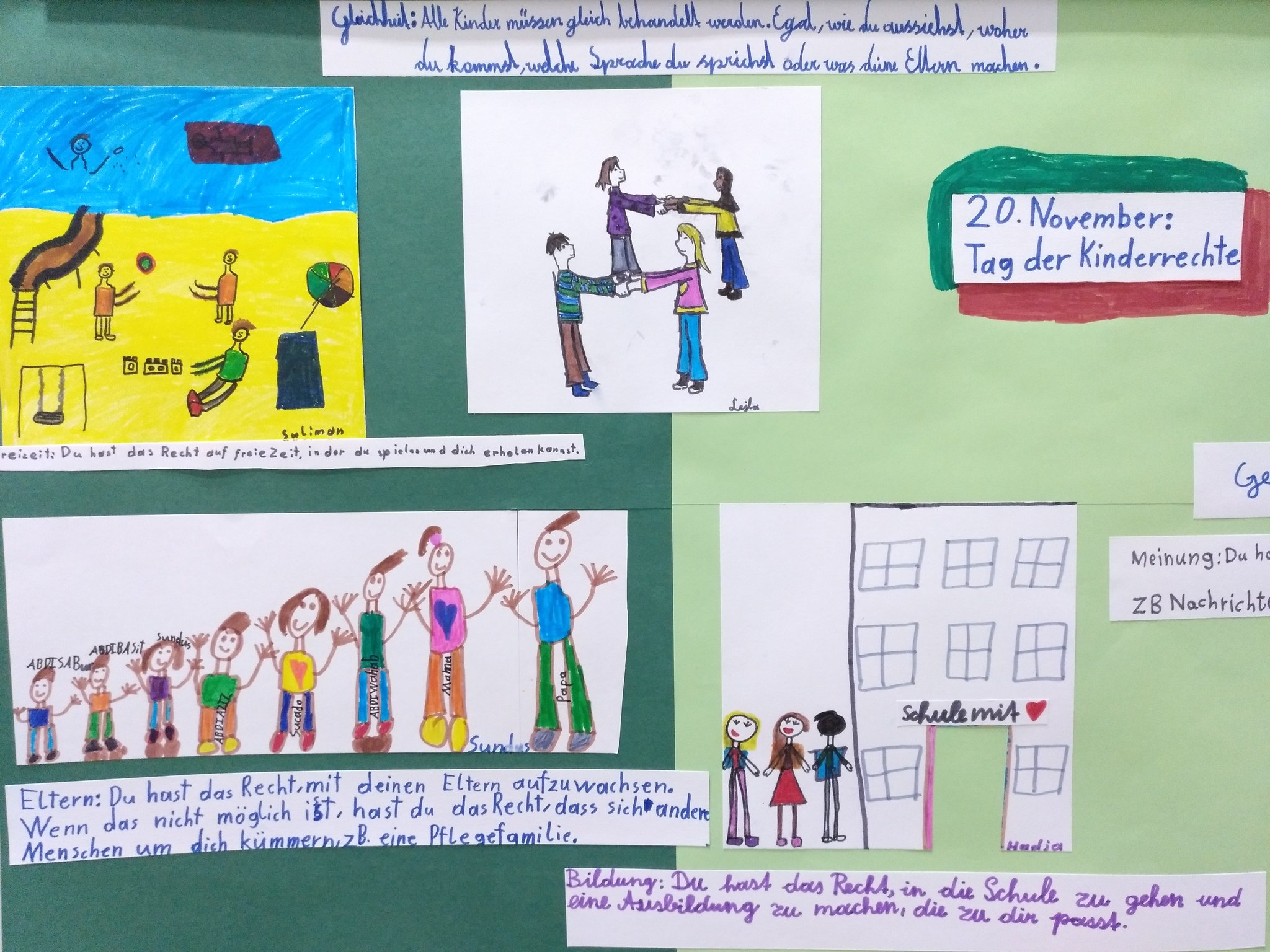 „Die Leitidee ‚Kinder stark machen‘ leben wir schon seit vielen Jahren an unserer Schule Im Rahmen der Projekttage ‚Kinderrechte‘ sollen sich unsere Schülerinnen und Schüler aktiv, mit Kopf, Herz und Hand mit der doch recht schwierigen Thematik auseinandersetzen, sie begreifen und erleben. Eigentlich sollten Kinderrechte selbstverständlich sein Trotzdem werden sie jeden weltweit gebrochen und missachtet Südlich der Sahara stirbt in Afrika jedes 4 Kind vor seinem fünften Geburtstag In vielen Ländern der Welt werden Mädchen schlechter behandelt als Jungen Längst nicht alle Kinder dürfen zur Schule gehen. Informationen zum KinderrechtePlakat „Für mich bedeutet Freizeit, dass man nach der Schule das Recht hat, Fußball zu spielen oder sich mit Freunden zu treffen oder generell Spaß zu haben und auch mal an seine Konsole gehen zu dürfen Ich.